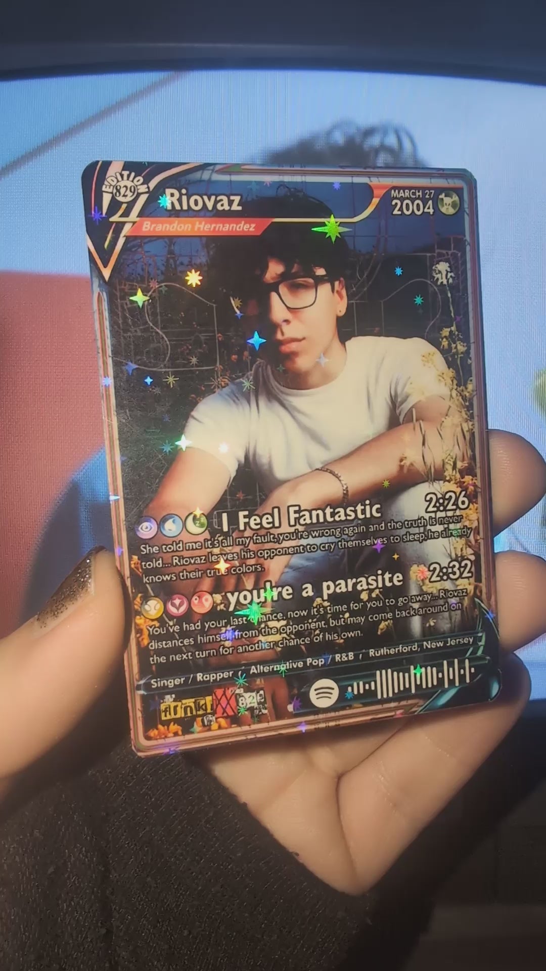 Features working Spotify code that when scanned, plays a song shown on the card!